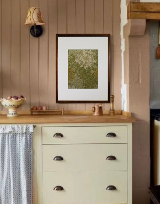 ‘Chrysanthemum – Pale Olive’ William Morris Unique Framed Print | Vintage Floral Unique Wallpaper Wall Art