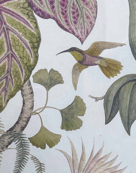 Sanderson 'Bird of Paradise & Orchid' | Tropical Bohemian Hummingbird Print in Vintage Decorative Gold Frame