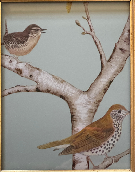 Sanderson 'Woodland Chorus' | Sky Blue Wren & Thrush Pretty Print in Unique Brown & Gold Frame