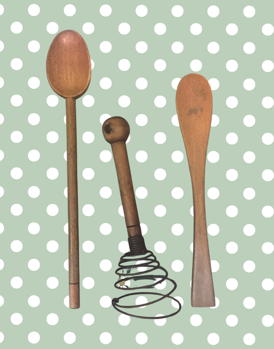 Antique Wooden Kitchen Utensils Trio of Coil Whisk, Cooking Spoon and Spatula | Perfect Mid-Century Styling Props
