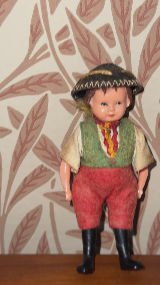 Antique German Celluloid Boy Doll Collctable | Dressed in Felt Clothing with Moulded Hair and Hat