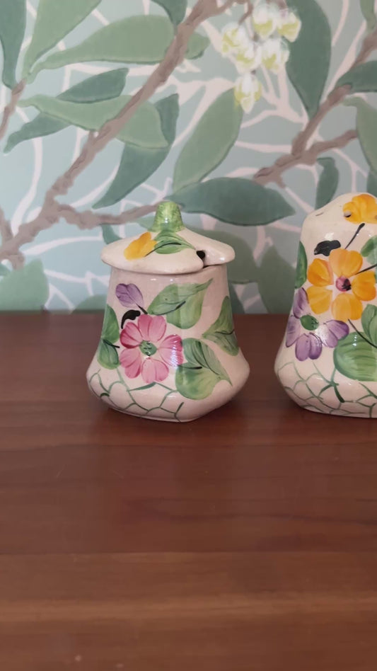Floral Ceramic Pepper Shaker & Mustard Pot Set | 1950s Kitchenalia