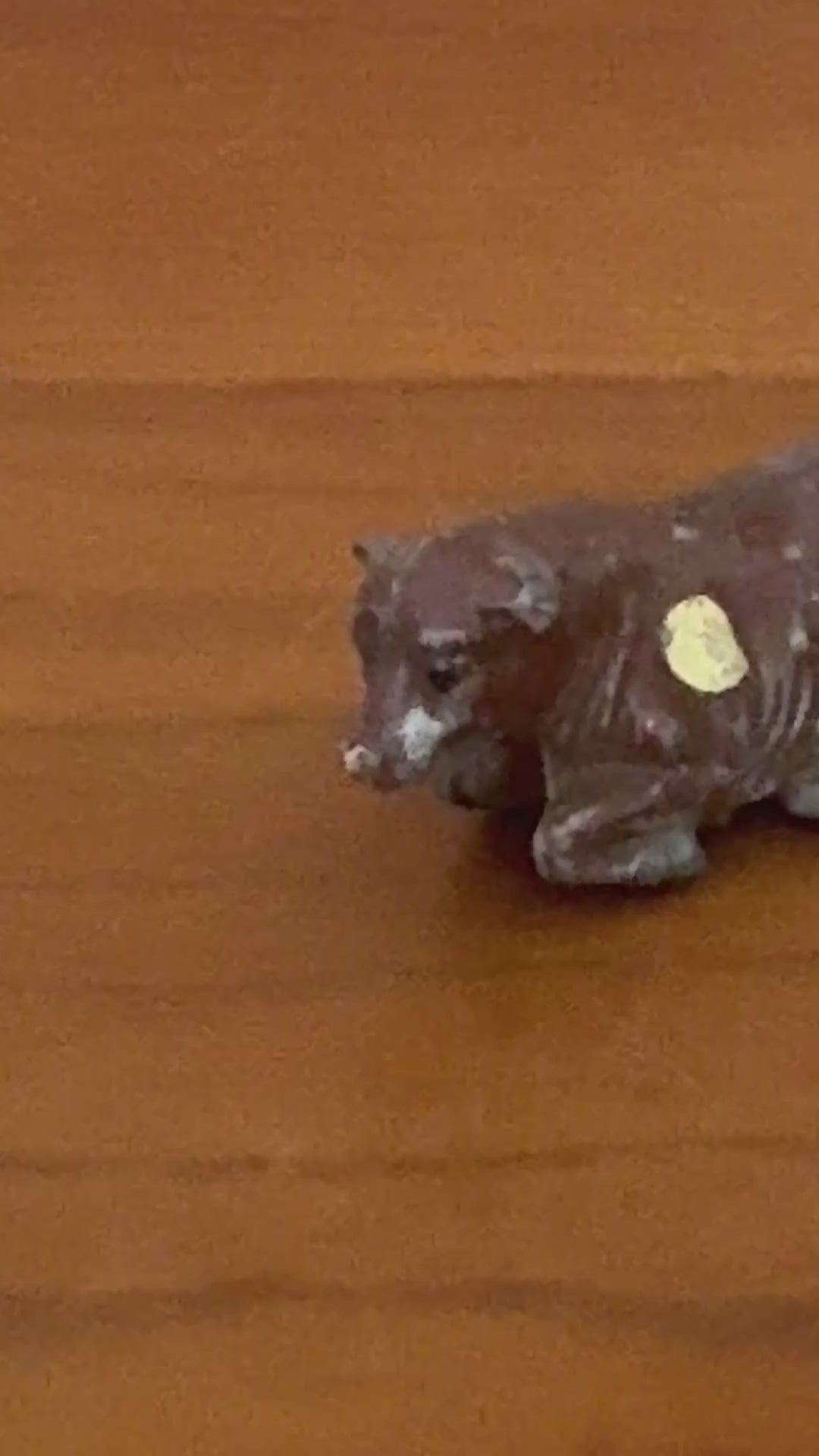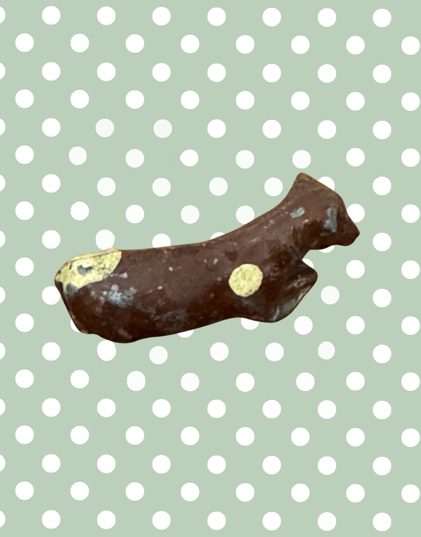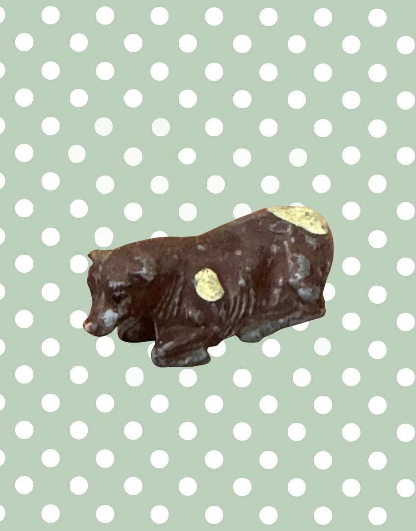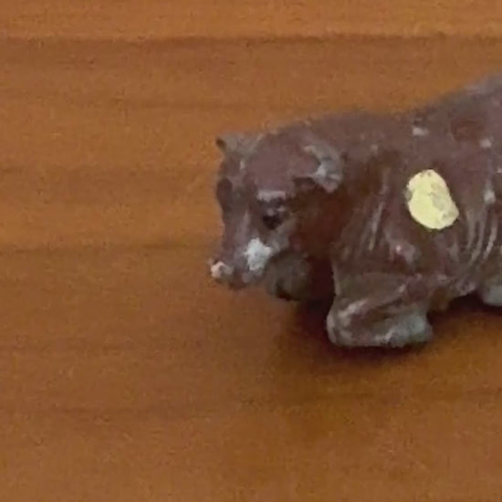 A peaceful medium-sized cow or calf lying down, painted in brown with cream patches. Produced by John Hill & Co in the 1920s, this collectable carries the COPYRT ENGLAND stamp, ensuring authenticity for dedicated toy collectors.